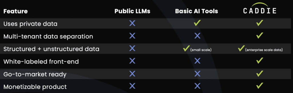 With Caddie AI, you can turn your proprietary data into a live, branded, revenue-ready AI product in days.